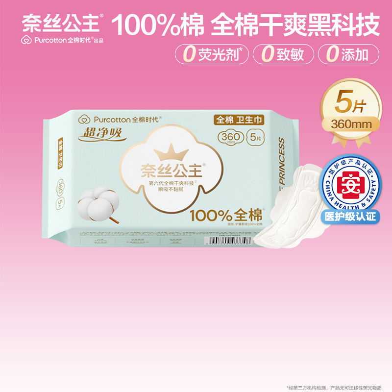全棉时代奈丝公主超净吸全棉亲肤加长夜用超博卫生巾360mm/5片