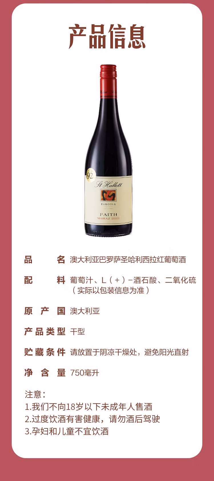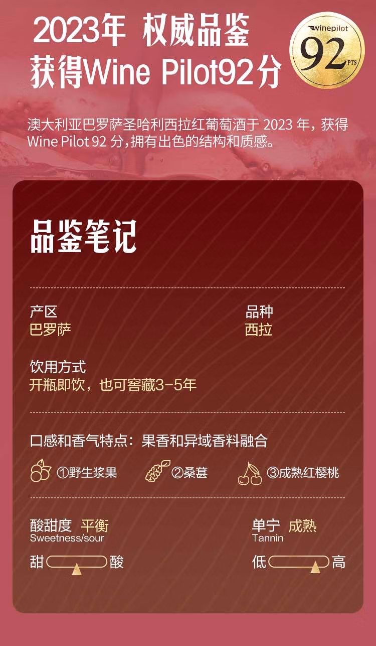 山姆澳大利亚巴罗萨圣哈利西拉红葡萄酒