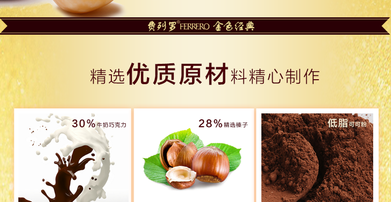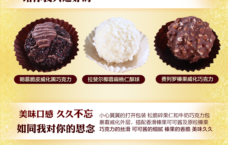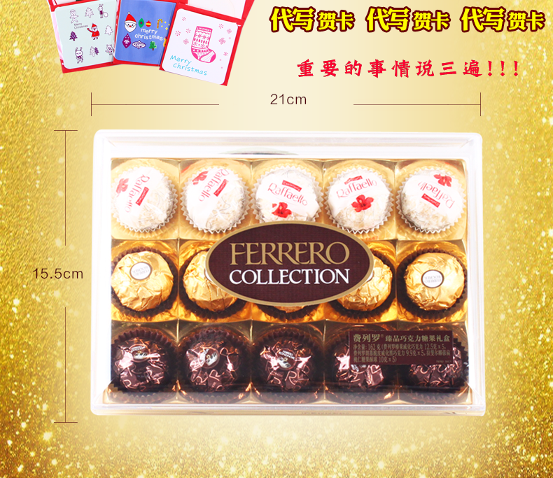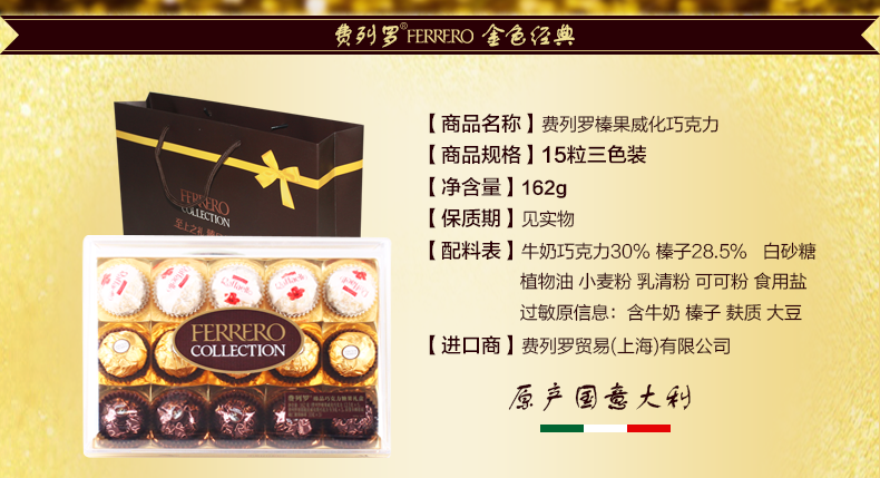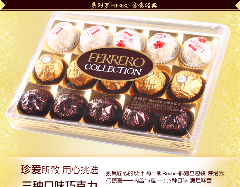 费列罗T15粒三色装糖果礼盒 162克 礼盒尺寸大约为:21cm*15.5cm(送女神,既有面子又很精巧!) 三种味道的巧克力 一盒满足您的味蕾